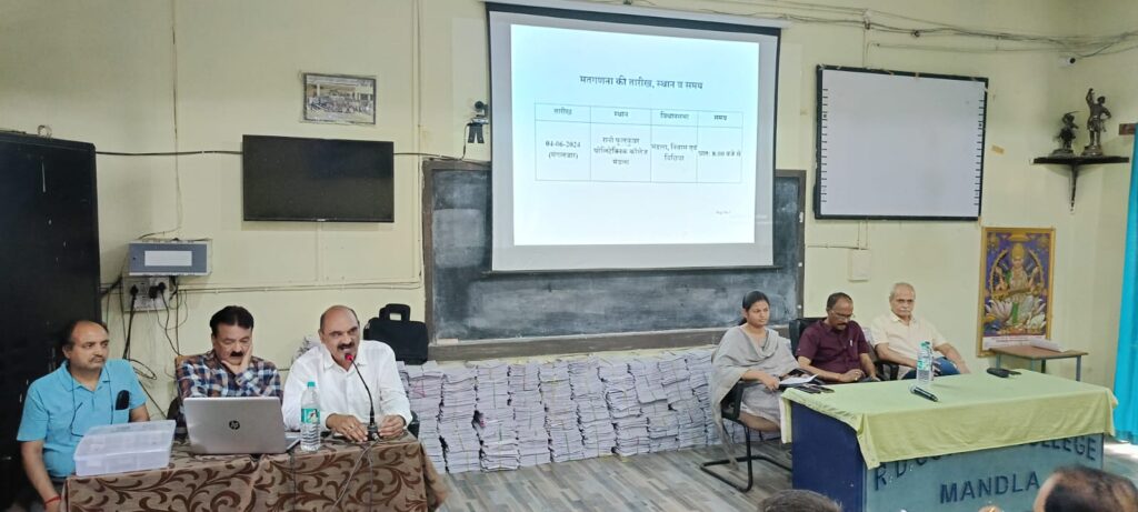 लोकसभा सामान्य निर्वाचन 2024 के तहत 4 जून 2024 को होने वाली मतगणना के लिए नियुक्त गणना अभिकर्ताओं का प्रशिक्षण रानी दुर्गावती शासकीय स्नातकोत्तर महाविद्यालय मंडला में आयोजित किया गया। इस अवसर पर अपर कलेक्टर एवं उप जिला निर्वाचन अधिकारी राजेन्द्र कुमार सिंह ने कहा कि सभी अभिकर्ता निर्धारित दिनांक को प्रातः 7 बजे गणना स्थल पर प्रवेश करें। परिचय पत्र धारण करें तथा अपना नियुक्ति पत्र साथ में रखें। उन्होंने कहा कि मतगणना स्थल पर 3 स्तर की सुरक्षा व्यवस्था है। परिसर में प्रवेश करते समय सुरक्षा जांच में सहयोग प्रदान करें। मतगणना दल को अपेक्षित सहयोग प्रदान करें तथा मतगणना की गोपनीयता बनाए रखें। इस अवसर पर संयुक्त कलेक्टर अरविंद सिंह, एसडीएम नैनपुर सोनल सिडाम सहित संबंधित उपस्थित रहे।