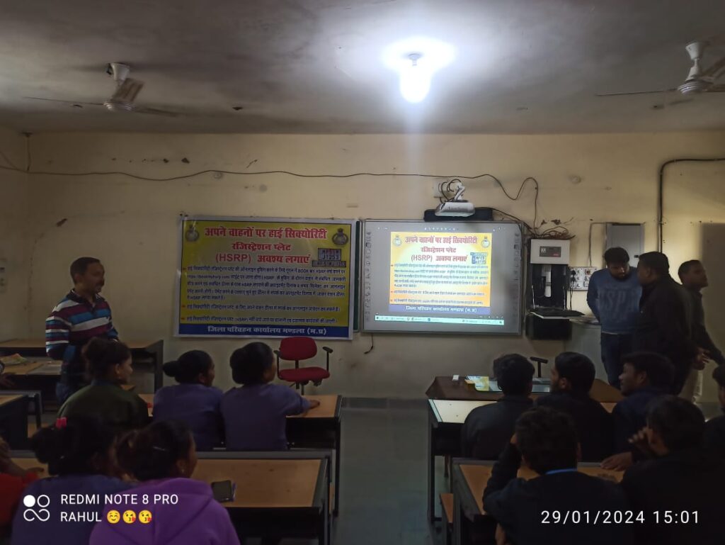 1 अपै्रल 2019 के पूर्व पंजीकृत वाहनों पर हाई सिक्यूरिटी रजिस्ट्रेशन प्लेट (एचएसआरपी) लगाये जाने के संबंध में जिला परिवहन कार्यालय मण्डला द्वारा शासकीय औद्योगिक प्रशिक्षण संस्था (आई.टी.आई.) मण्डला में शिविर का आयोजन किया गया। शिविर में प्रोजेक्टर के माध्यम से हाई सिक्यूरिटी रजिस्ट्रेशन प्लेट की ऑनलाइन बुकिंग एवं एचएसआरपी लगवाने की पूरी प्रक्रिया समझाई गई। शिविर में समस्त वाहनों में एचएसआरपी अनिवार्यतः लगाए जाने हेतु अनुरोध किया गया एवं बिना हाई सिक्यूरिटी रजिस्ट्रेशन प्लेट लगे वाहनों के चालान करते पाये जाने पर चालानी एवं दण्डात्मक कार्यवाही होने के संबंध में भी बताया गया। शिविर में आई.टी.आई के प्राचार्य, स्टॉफ, छात्र-छात्राऐं एवं जिला परिवहन कार्यालय मण्डला का स्टॉफ उपस्थित रहा।