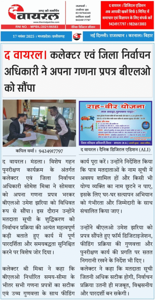 Mandala mein Special Intensive Revision Program ke tahat Collector aur District Election Officer Somesh Mishra ne apna ganana prapatr (Form) B.L.O. Umesh Jhariya ko sahi tareeke se saupa. Collector Mishra ne kaha ki voter list ka shuddhikaran chunav prakriya ka bahut important hissa hai, isliye isme poori transparency aur time par kaam hona chahiye.