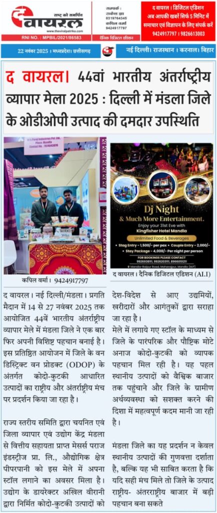Delhi me chal raha 44वां भारतीय अंतर्राष्ट्रीय व्यापार मेला 2025 इस बार Mandla जिले ke One District One Product (ODOP) ko lekar kaafi चर्चा में है. जिले ke प्रोडक्ट Kodo & Kutki ne मेले में अपनी ek अलग पहचान बना ली hai.